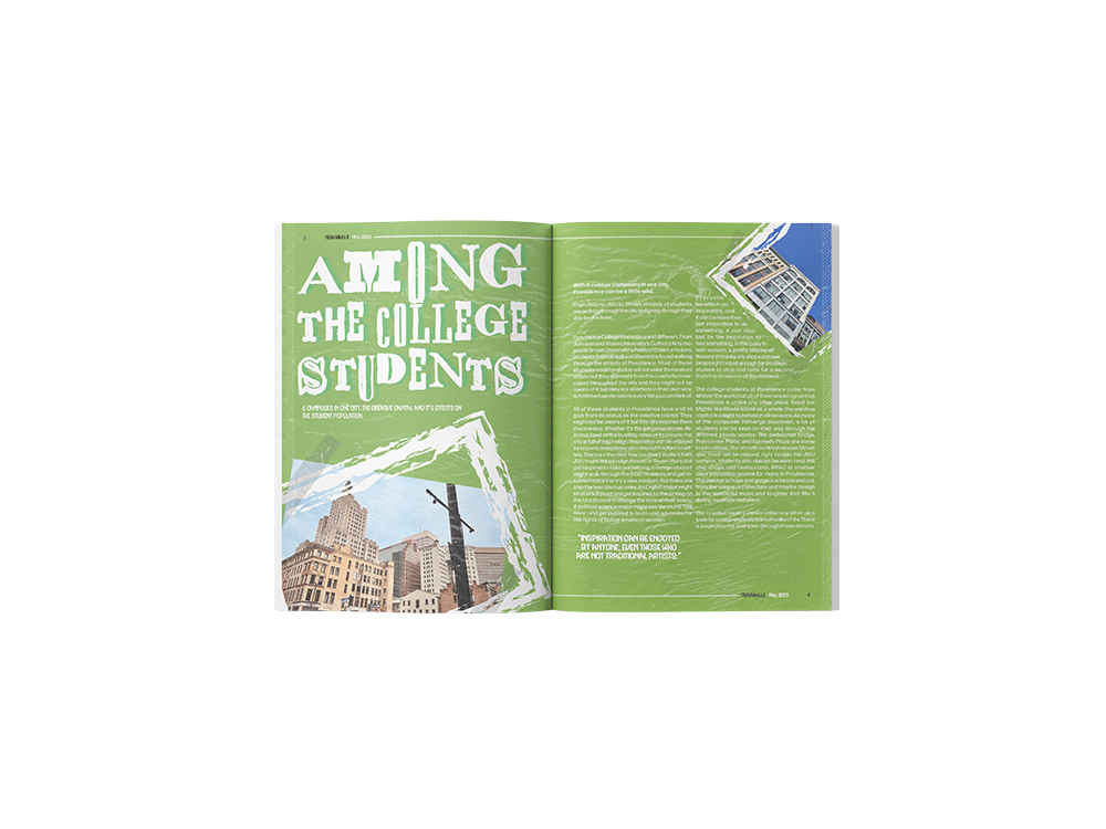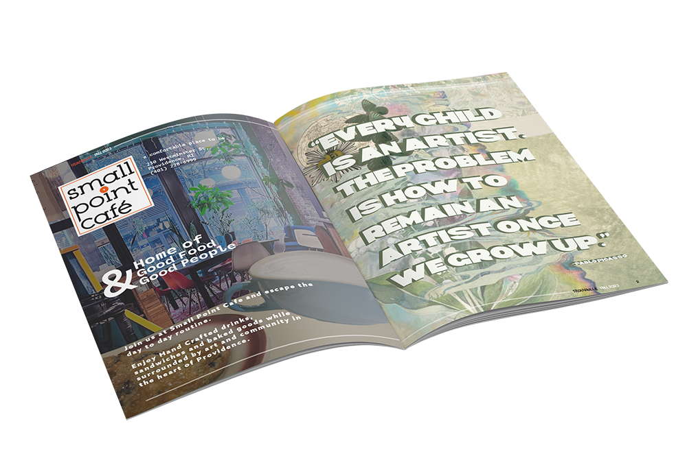 For this project I was tasked with creating a minizine on a topic of my choice. The minizine ‘Trouvaille’, named after the French word for ‘lucky find’, is a collection of art and design inspired by a variety of sources, from historical movements, local architecture, and modern design to everyday sights like cracks on the sidewalk or the pattern of bricks on a wall. Aimed at creatives, artists, and designers in the city of Providence, Trouvaille features bold colors and edgy typography derived from handlettering and brush scripts. As part of the project, I was tasked with writing and designing a main article spread, an interview spread, a creative page, a full page ad for a company of my choosing, a JWU ad and obviously a cover.
